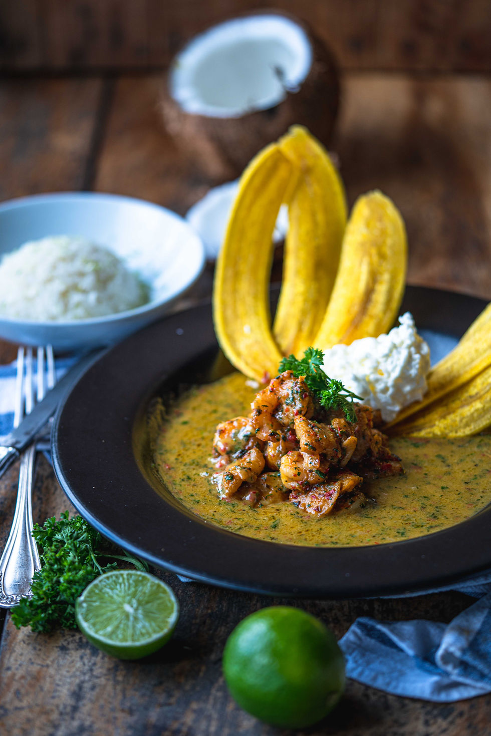 Camarón, pescado, achiote, ají dulce y coco con hierbas de azotea. acompañado de arroz con coco, lascas de platano y espuma de coco. ademas de una salsa a base de leche de coco concentrado, crema de leche y fume de pescado.